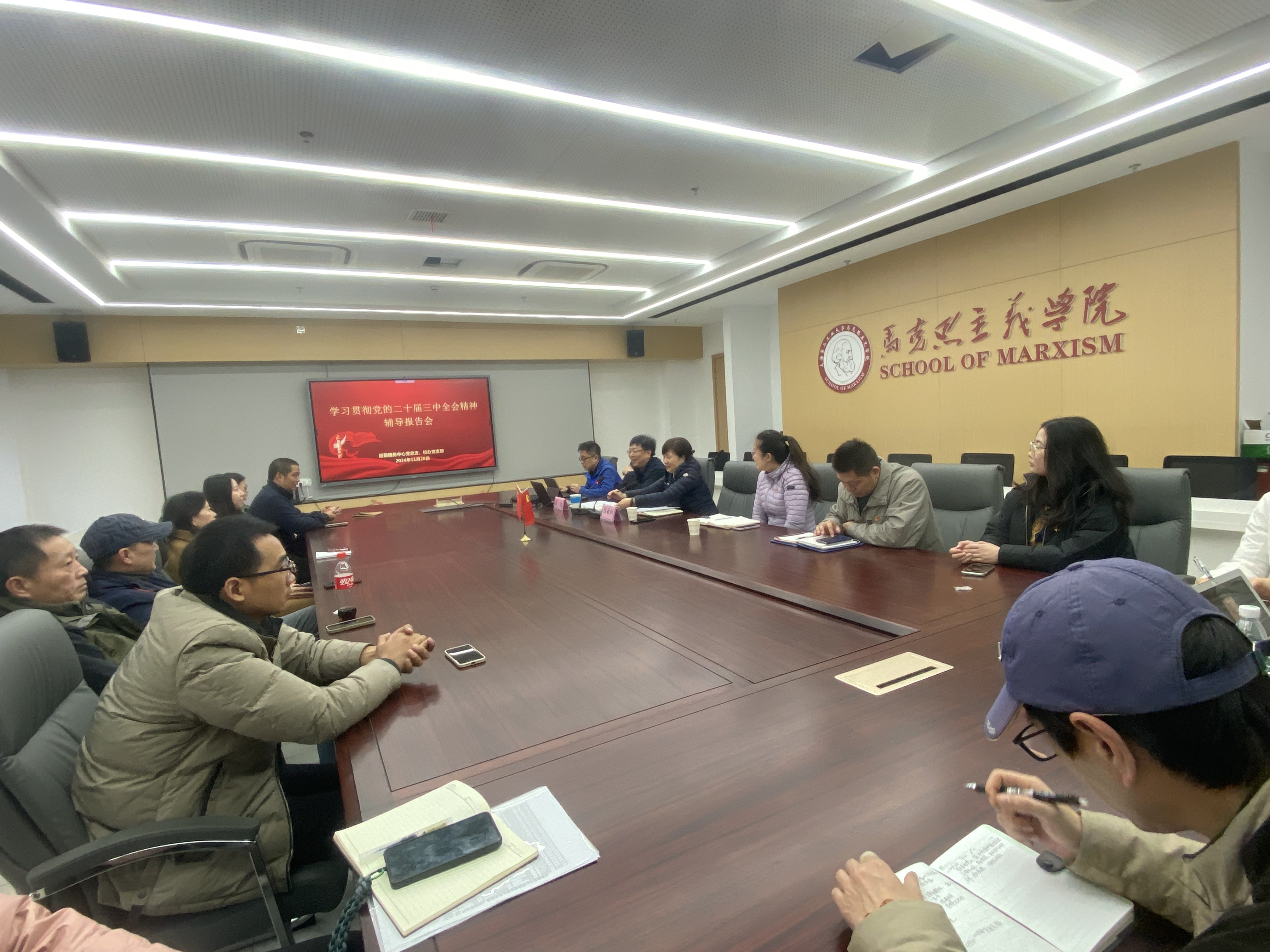 为深入学习贯彻党的二十届三中全会精神,进一步统一思想认识、凝聚奋进共识,11月28日下午,后勤服务中心党总支和校办党支部联合举办学习贯彻党的二十届三中全会精神辅导报告会,马克思主义学院党支部书记刘文教授作辅导报告,后勤党总支书记陈敏俐主持报告会。后勤服务中心全体党员、校办和发规处全体党员参加。