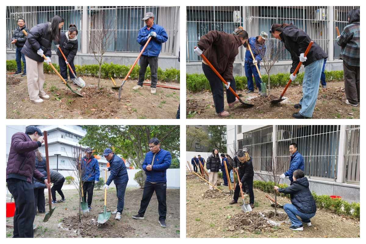 绿色校园实践则聚焦生态育人。三方党支部在生活园区启动“党建林”共建活动。后勤服务中心发挥专业优势,提前完成土壤检测、苗木遴选、工具消杀等多项准备工作,并邀请专业技术人员现场指导。党员们分组协作,挥锹挖坑、扶苗培土、提水浇灌,共同栽种下象征希望的树苗,并挂牌成立“外文学院劳动教育实践基地”。