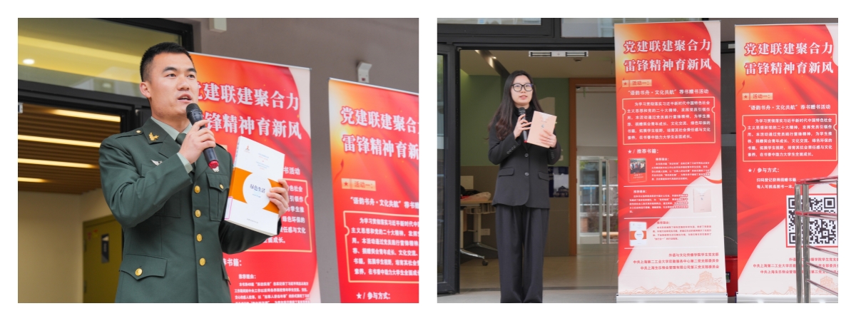 本次活动以“双轮驱动”构建育人矩阵。在书香校园建设方面,外文与传播学院学生党支部发挥专业优势,在“语韵书舟·文化共航”荐书环节,外文学院学生党员,向师生推荐《习近平与大学生朋友们》《乡土中国》《绿色中国》等经典书籍,传递知识力量与红色文化。