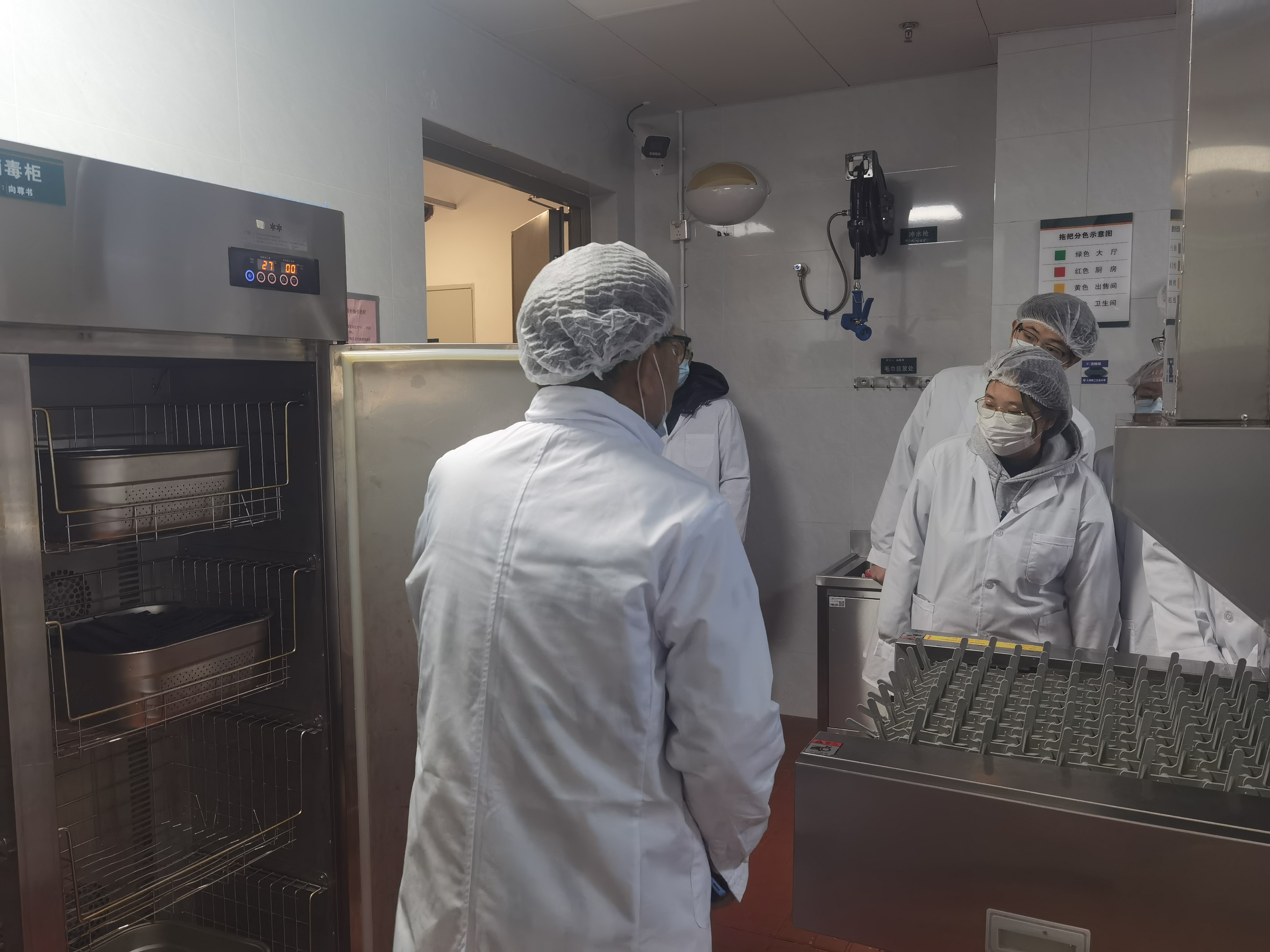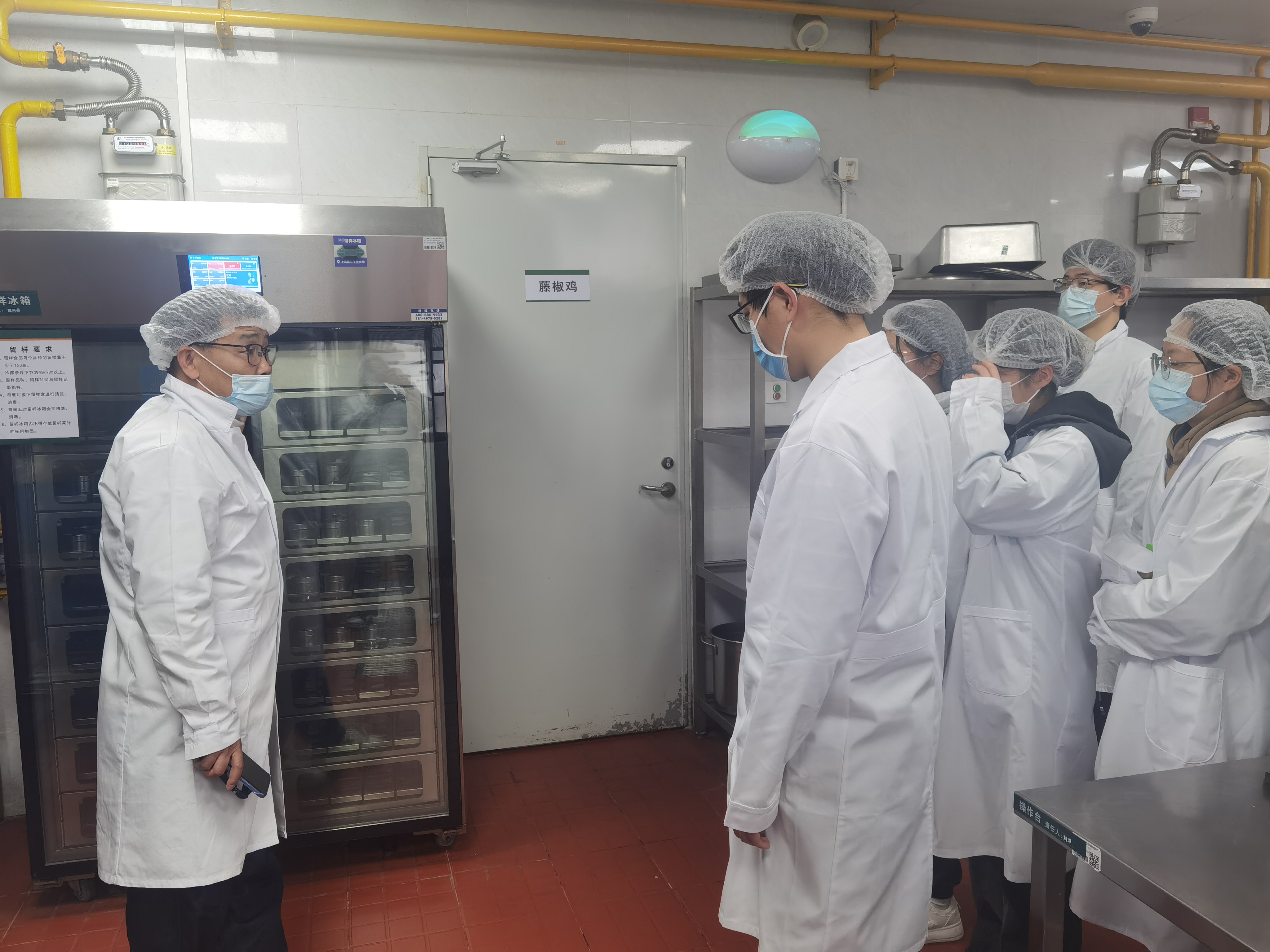 第一党支部全体党员和学生监督员代表在学校智慧食堂金海苑集合,穿工作服、戴好口罩和防尘帽,有序进入食堂后厨区域。金海苑食堂负责人向参观师生介绍了智慧系统在提高食堂工作效率、保障食品安全、优化服务质量方面的应用,特别强调在食品安全保障方面的措施,如食材采购检验、食品加工过程中的卫生、餐具消毒流程等,让师生们了解食堂为确保食品安全所做的工作。
